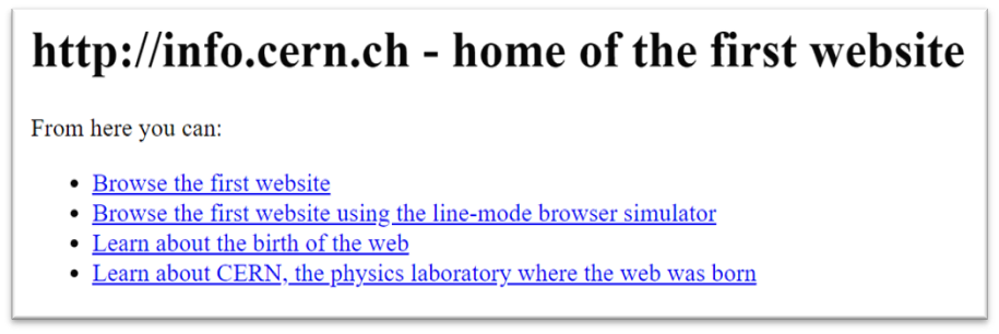 Tim Berners-Lee, der britische Physiker und Informatiker gilt als Erfinder des World Wide Web, das er am 12. März 1989 bei CERN als Prinzip des “Hypertexts” vorschlug und am 12. November 1990 mit Robert Cailliau der Öffentlichkeit präsentierte und bis zum 20. Dezember 1990 mit der ersten Website der Welt unter der Adresse www.info.cern.ch vollendete. Die Seiten wurden in der Beschreibungsspracht HTML erstellt.
